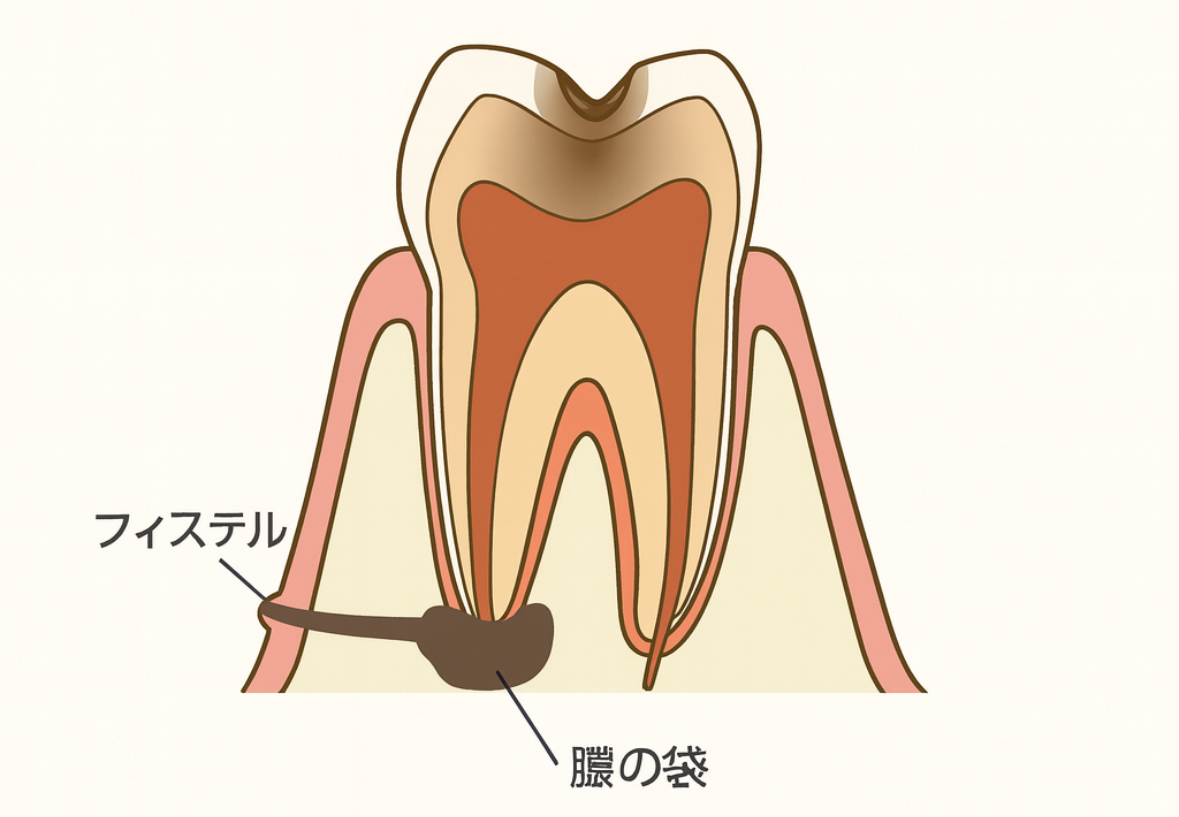 歯の神経が死んでしまうと、根の先に炎症が起きて膿が溜まり、それが歯ぐきに小さな出口をつくります。これがフィステルです。