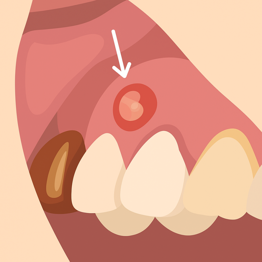 「歯ぐきに小さなできものができた」「膿の袋のようなものがある」と来院される方がいます。多くの患者さんは「腫瘍のようなものでは?」と心配されますが、実際には 虫歯が原因で歯の根に炎症が起こり、膿が出る通路(フィステル)ができている 事が多くあります。