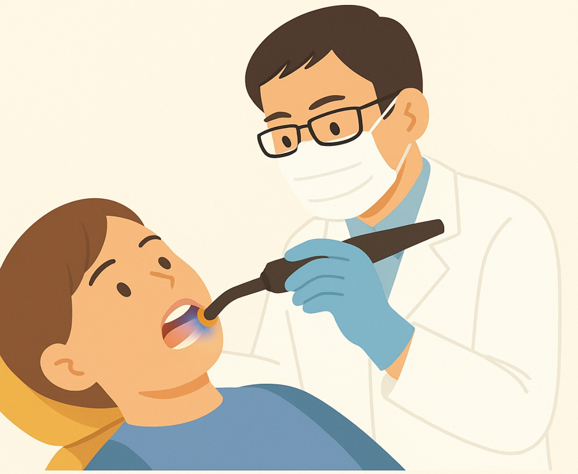 このブルーライトは「光照射器」と呼ばれる器械の光で、歯科治療では主に次のような場面で使われています。