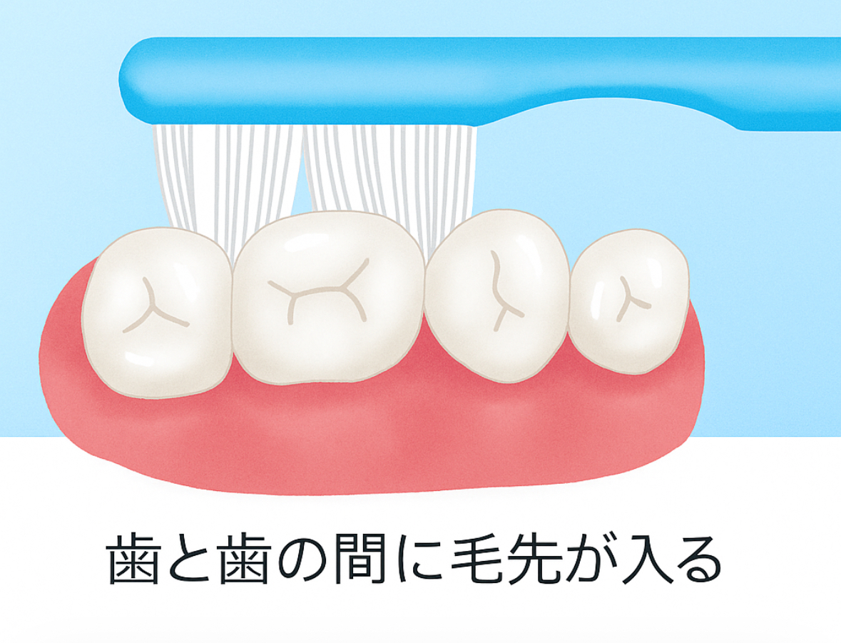 「毛先を歯と歯の間・歯と歯ぐきの間に入れ、逃げないように振動させるように磨く」