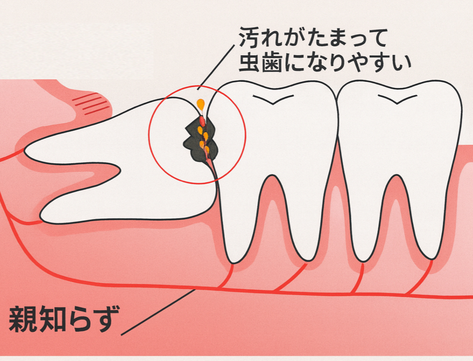 多くの親知らずは、手前に倒れ込んでいたり、半分だけ顔を出したりと“中途半端な生え方”をしています。すると手前の歯(第二大臼歯)と密着し、歯ブラシもフロスも届きません。