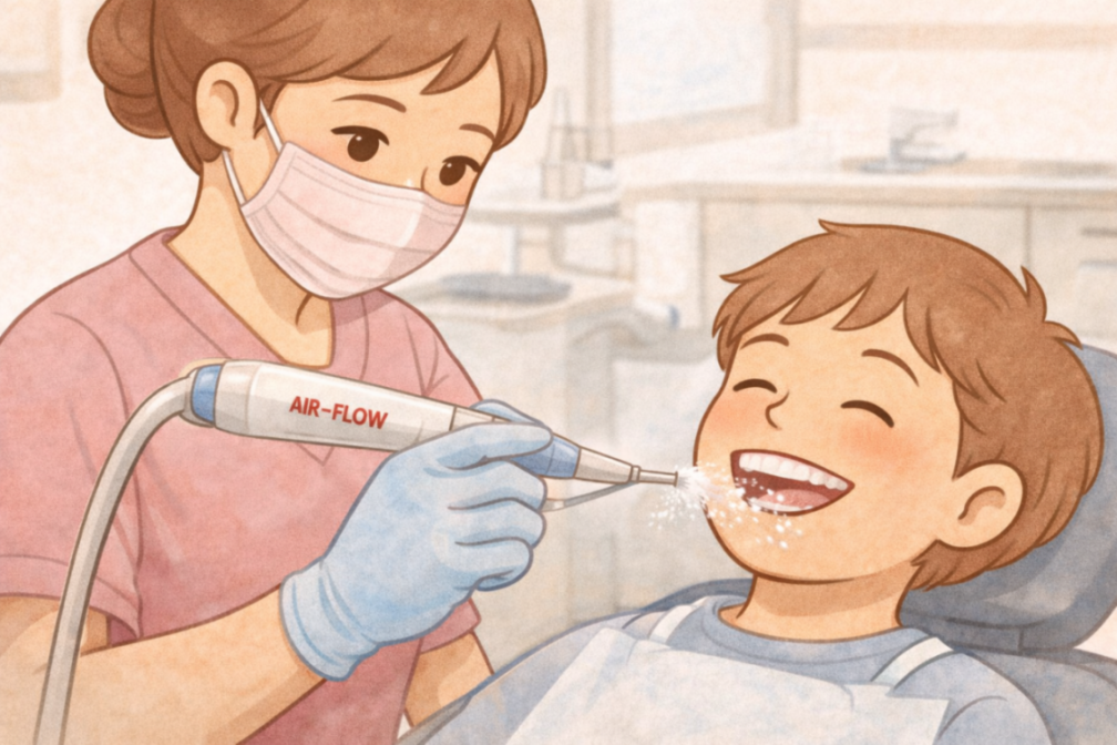 伊賀市で歯石取りというと「ガリガリされて痛い…」というイメージを持つ方が多いですが、当院では エアフロー(EMS)を全ユニットに導入し、できるだけ痛みの少ない歯石除去・クリーニングを行っています。