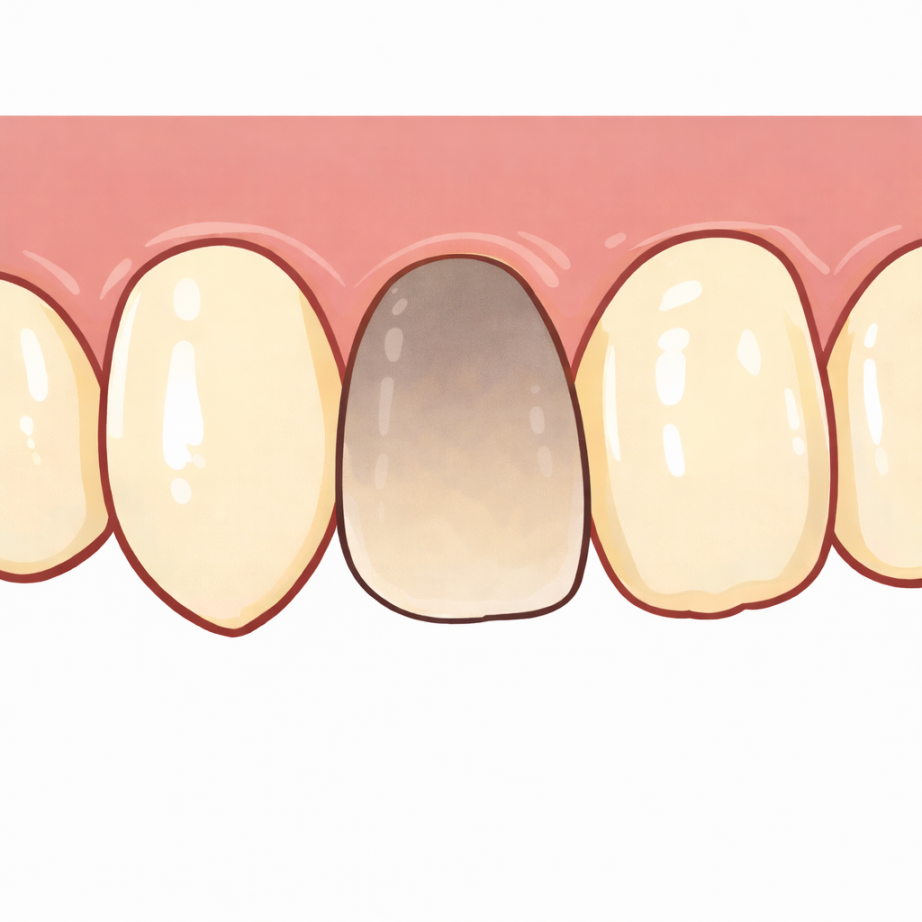 神経を取った歯はもちろんですが、外からの衝撃などがきっかけで、気づかないうちに神経が弱り、時間とともに変色してくることもあります。