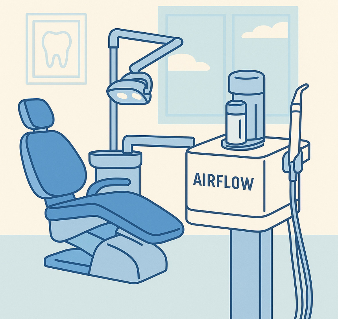 エアフローは、細かいパウダーを水と一緒に吹き付けることで、歯の表面や歯周ポケットにある汚れ(バイオフィルム)をやさしく取り除く機械です。