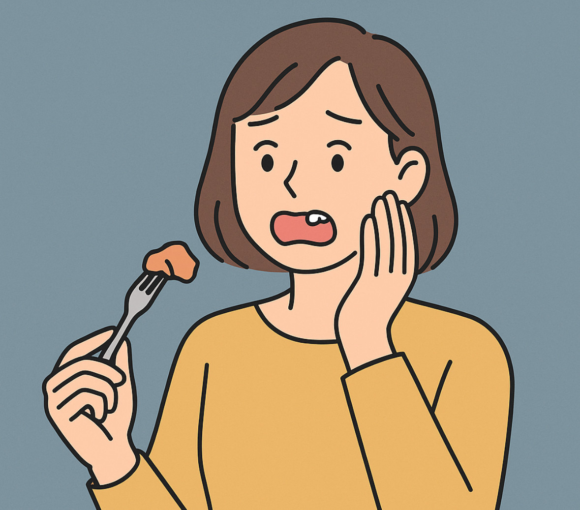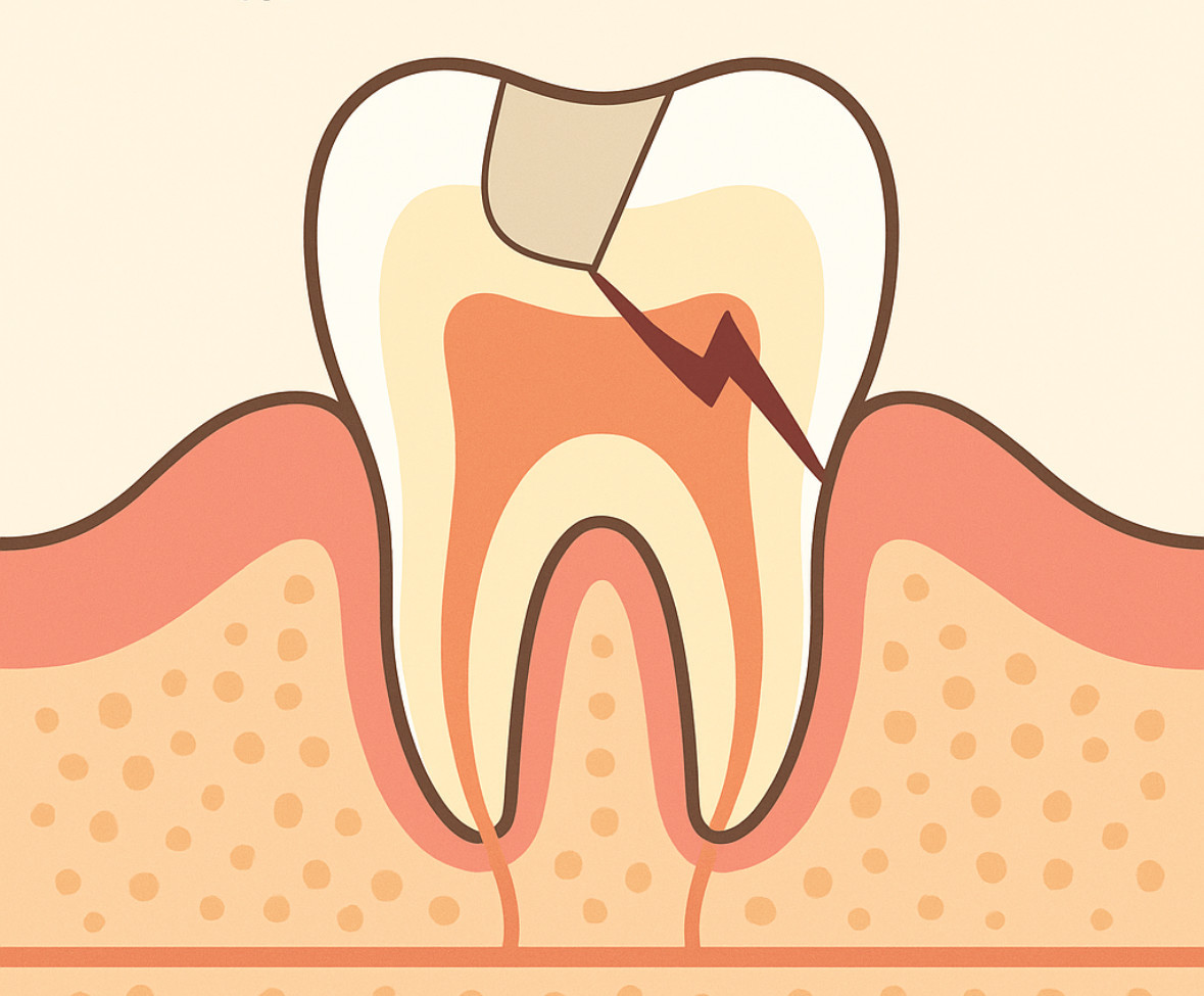 ■ スライド1:問題提起 【画像サイズ】1080×1920px メインテキスト(大きく) 「治療した歯が折れた…なぜ?」 補足テキスト ✔ 虫歯じゃないのに欠けた ✔ 被せ物の下が割れた ✔ 神経を取った歯が折れた イラスト案 → 食事中に歯が欠けて驚く人のイラスト。背景は落ち着いた色調で現実感を演出。