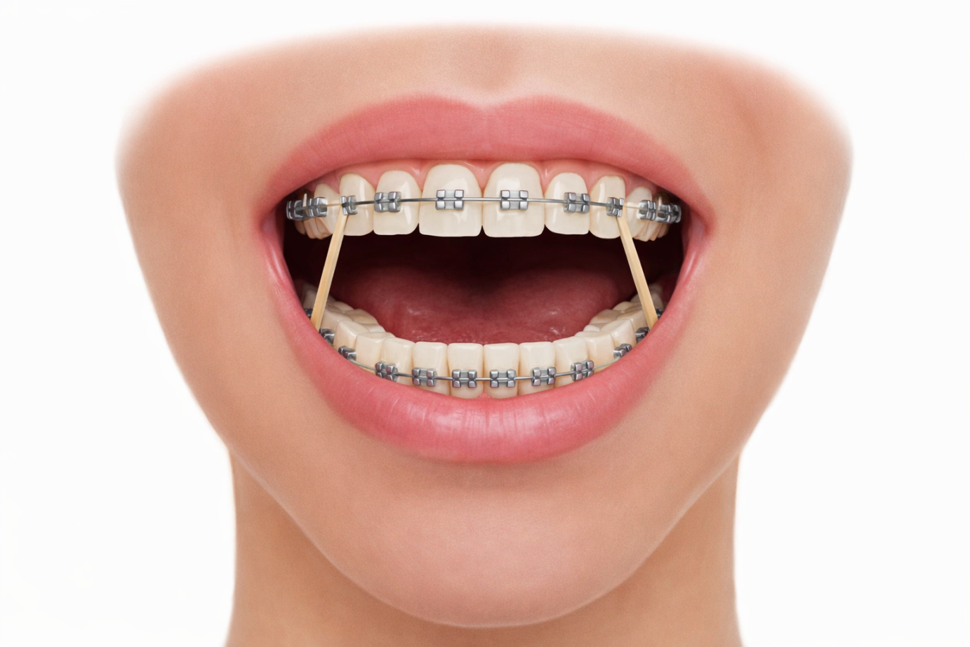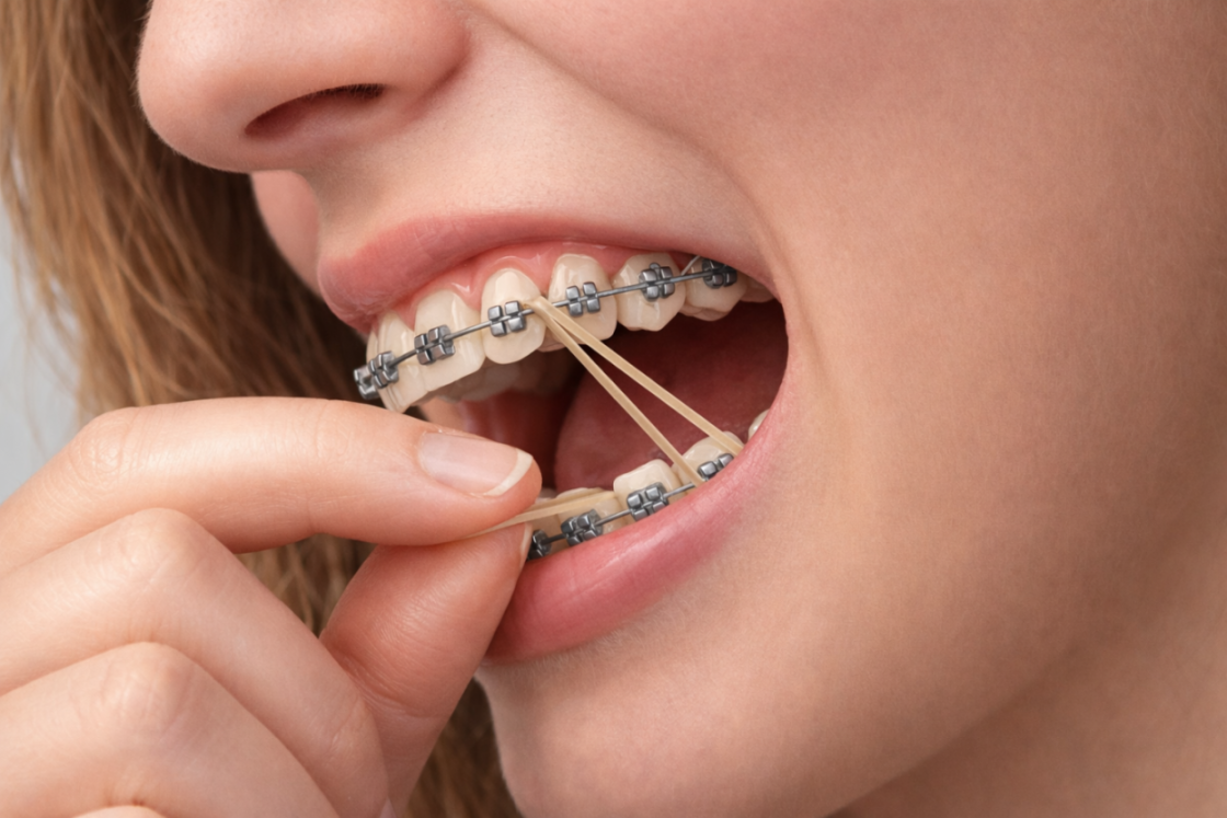顎間ゴムとは、上下の歯に引っかけて使う小さなゴムです。
