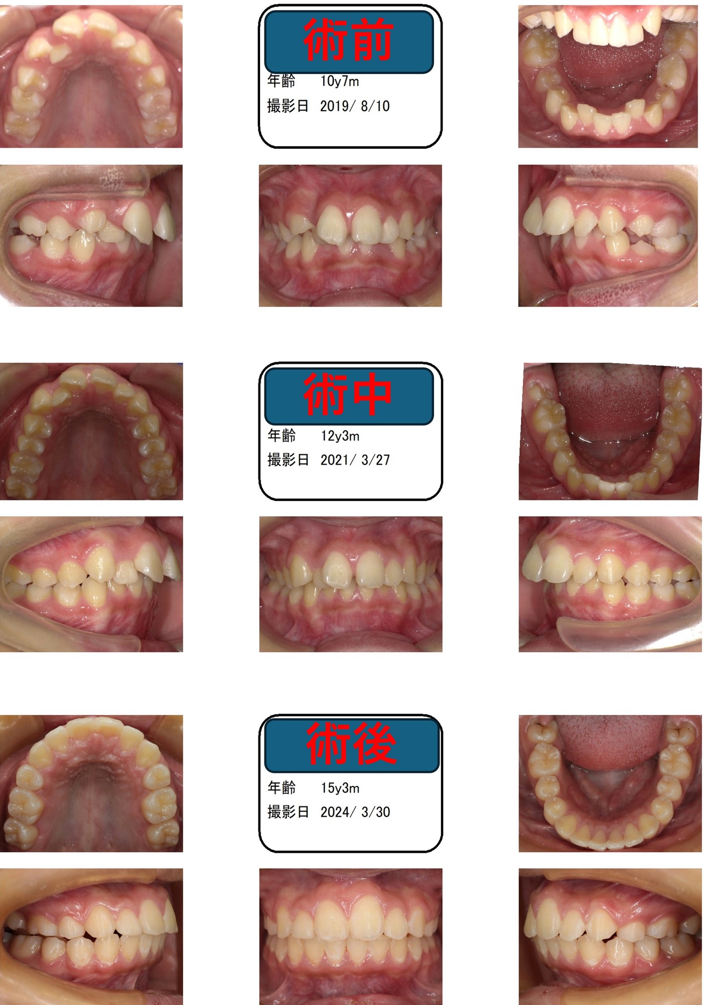 上左右一本ずつ歯を抜いて隙間を作り、上の前歯を後ろに下げます。ブラケット装置にて治療。