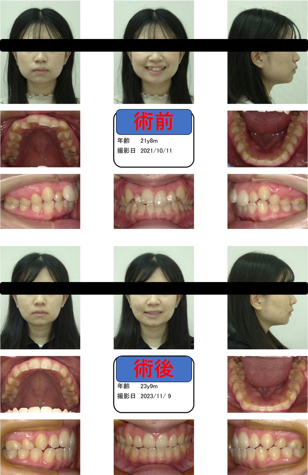 この症例においては、上の前歯に対して下の前歯が大きかったために、奥歯の咬み合わせは良いものの、最後の仕上がりで、上の前歯と下の前歯が同じような位置関係になってしまっています。