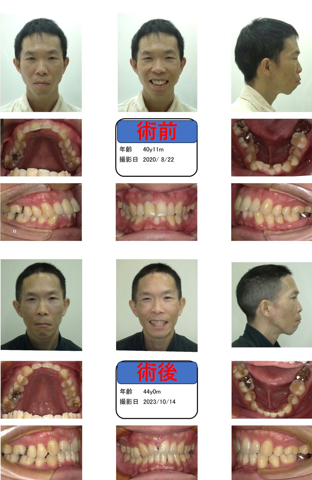 この症例は、下の歯がデコボコしており、上の歯はデコボコしていないために前にせり出してしまっており、相対的に上の前歯が下の前歯に対して前に突出しています。