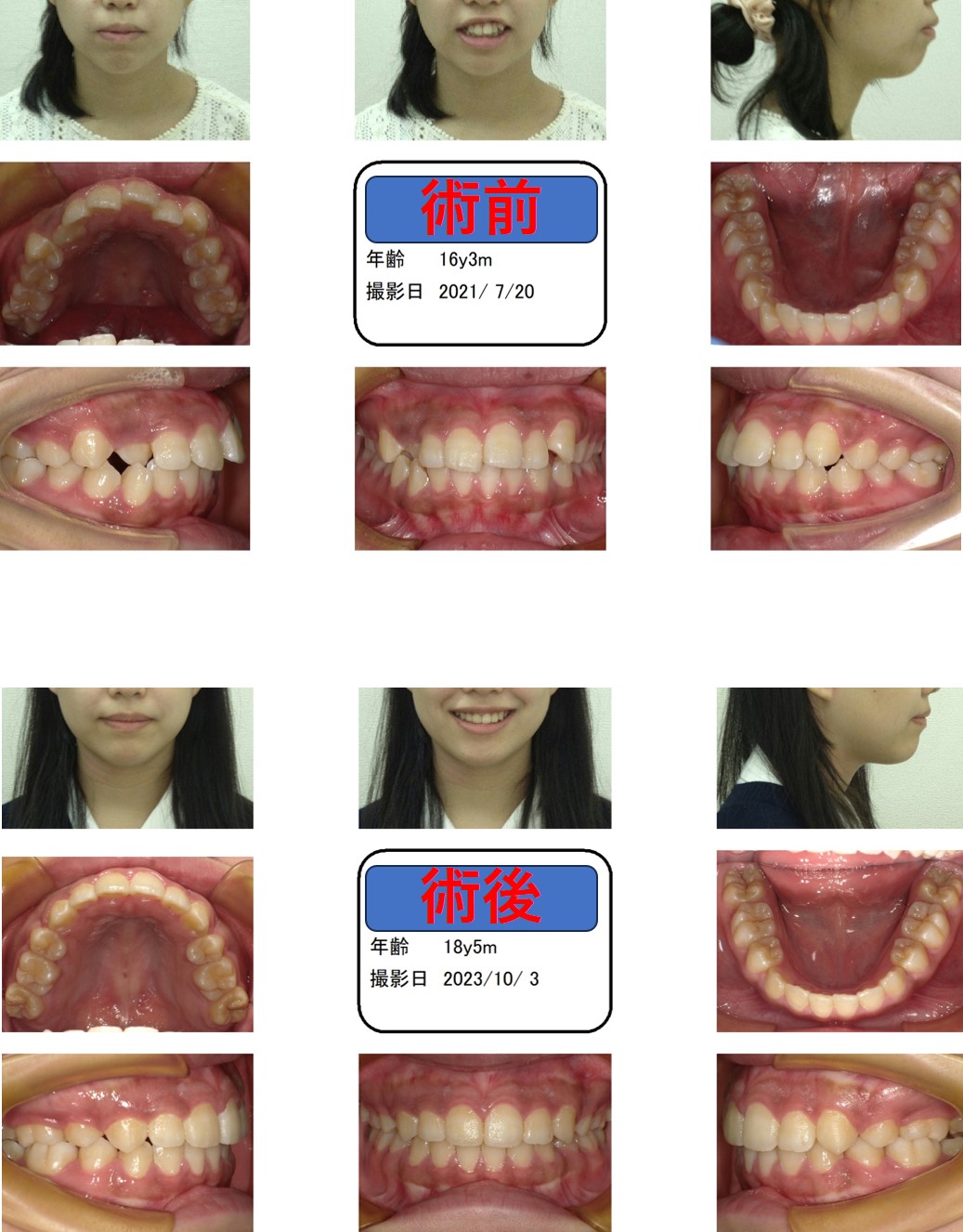 上下左右一本ずつ歯を抜いて隙間を作り、前歯のデコボコ・八重歯を改善します。