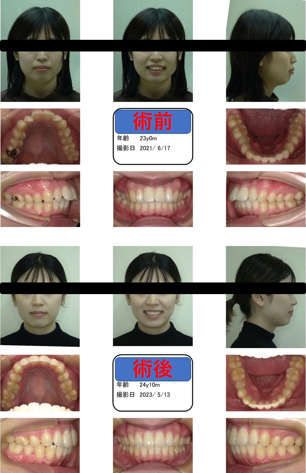 上左右一本ずつ歯を抜いて隙間を作り、上の前歯を後ろに下げます。ブラケット装置にて治療。
