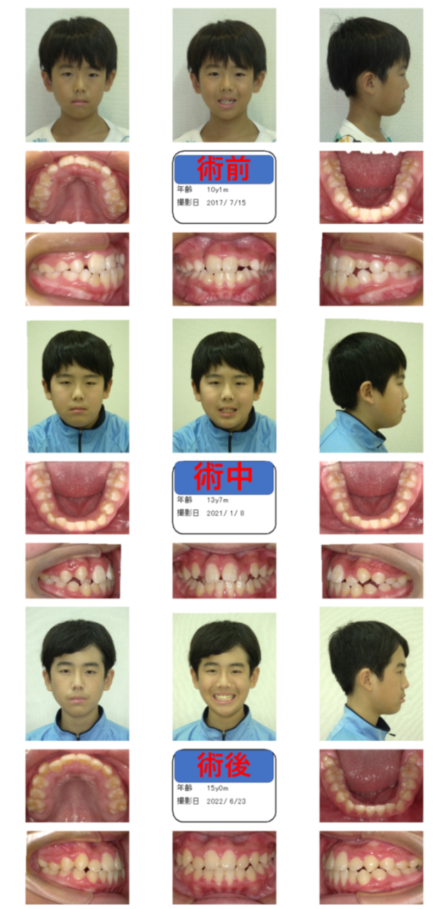 乳歯が残っている時に受け口だけ改善しておき、凸凹に関しては、永久歯が揃ってからブラケット装置にて治療。