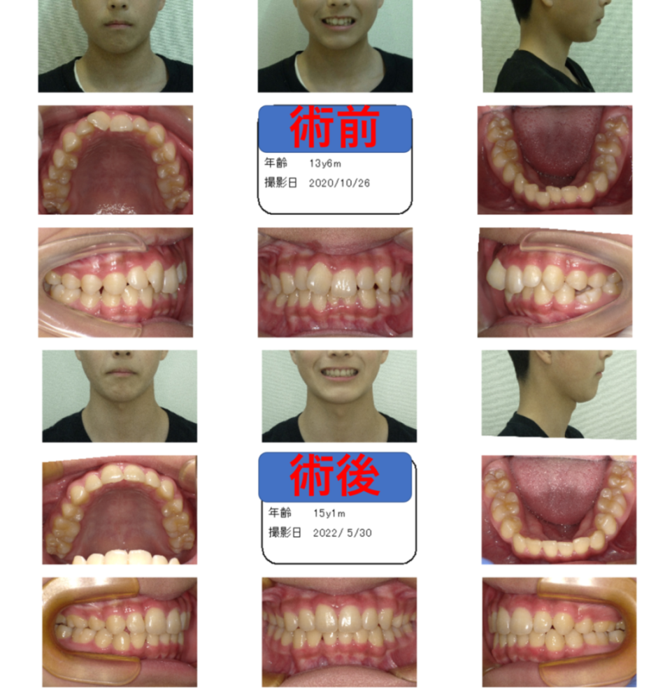 上下左右一本ずつ歯を抜いて隙間を作り、前歯のデコボコを改善します。