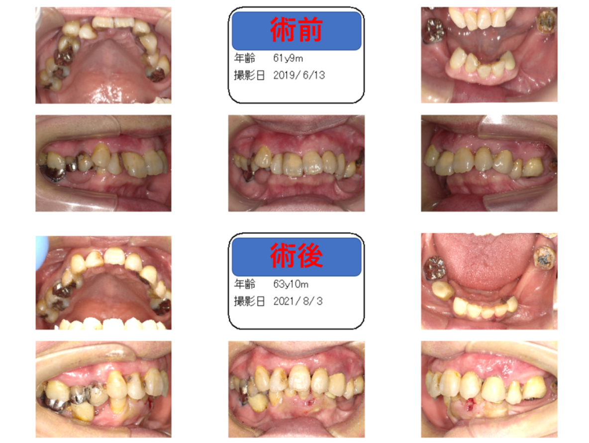 結果、右側の奥歯、前歯のかみ合わせを獲得することができ、入れ歯なしでも噛めるようになりました。
