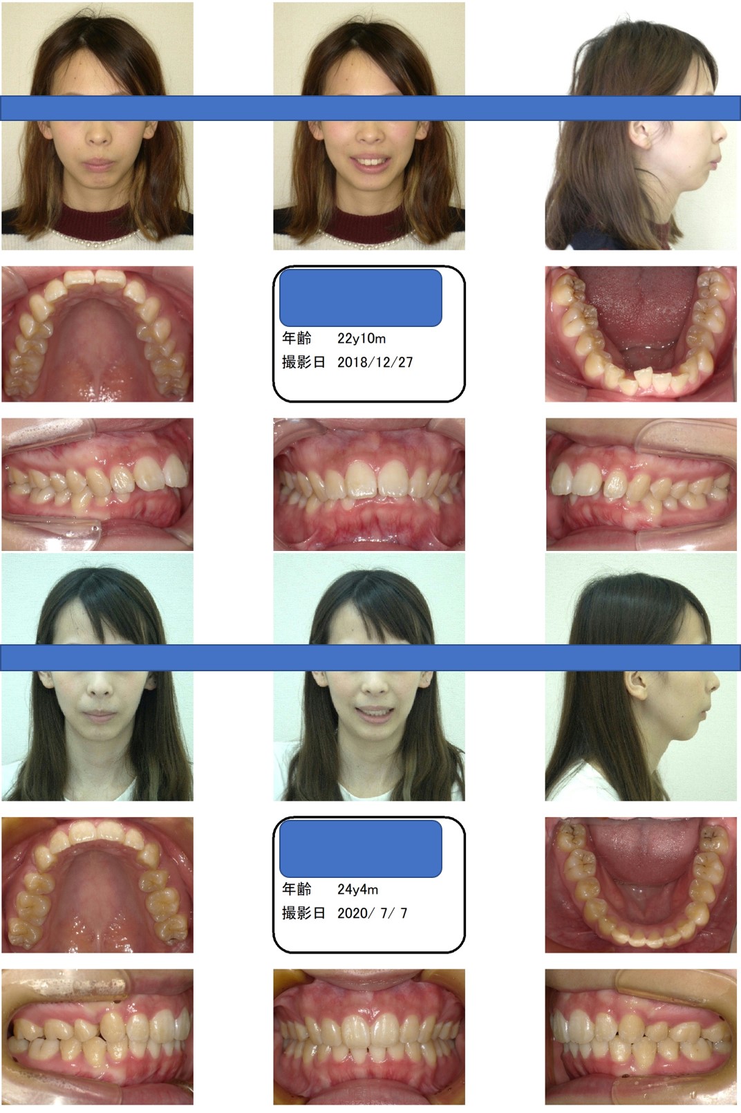 上左右一本ずつ歯を抜いて隙間を作り、上の前歯を後ろに下げます。ブラケット装置にて治療。