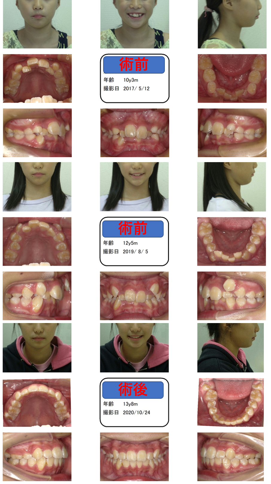 上左右一本ずつ歯を抜いて隙間を作り、上の前歯を後ろに下げます。ブラケット装置にて治療。