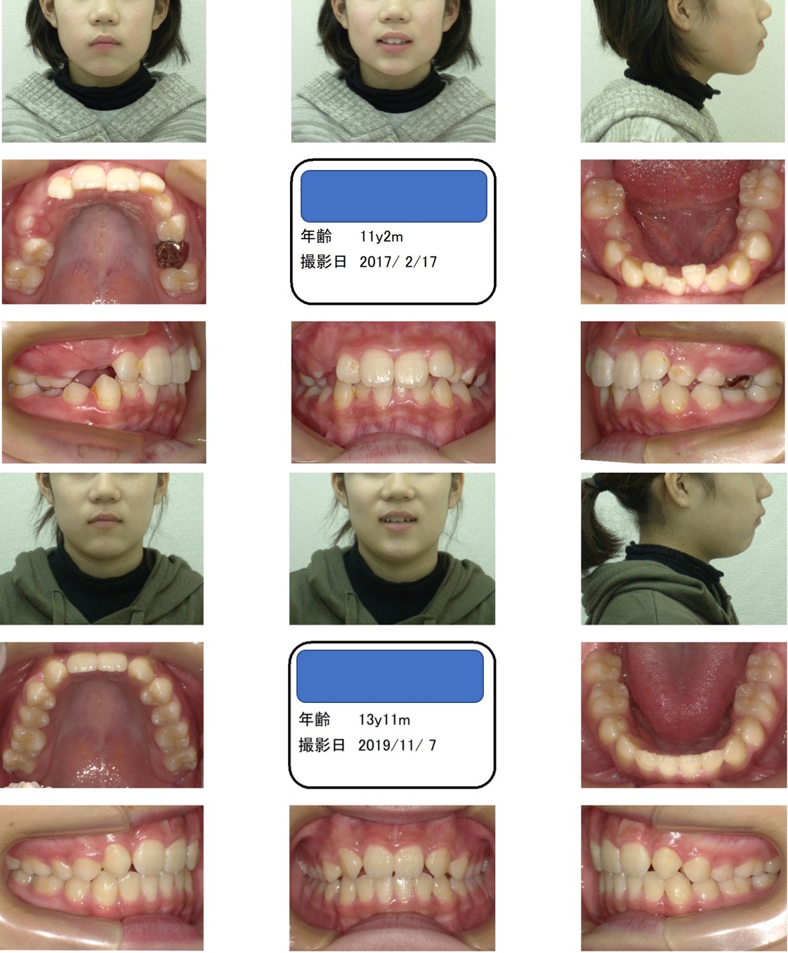 上下左右一本ずつ歯を抜いて隙間を作り、上下の前歯を後ろに下げ、口元を下げます。ブラケット装置にて治療。