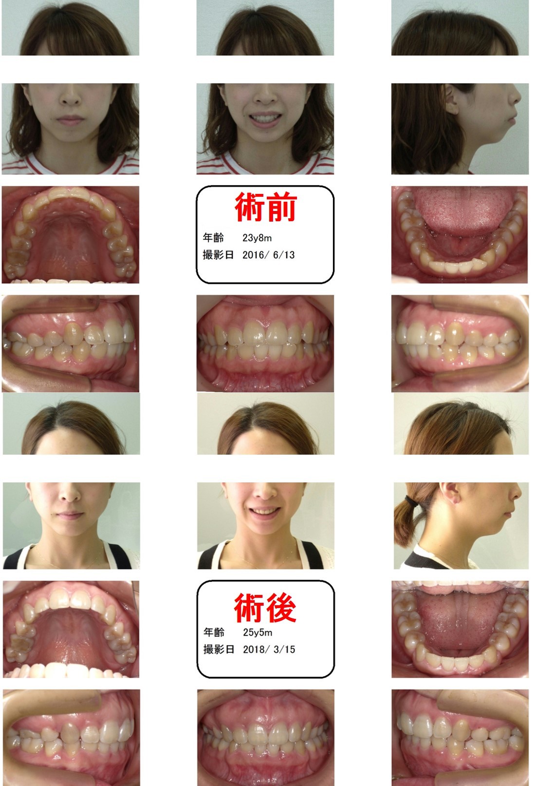 上下左右一本ずつ歯を抜いて隙間を作り、上下の前歯を後ろに下げ、口元を下げます。ブラケット装置にて治療。