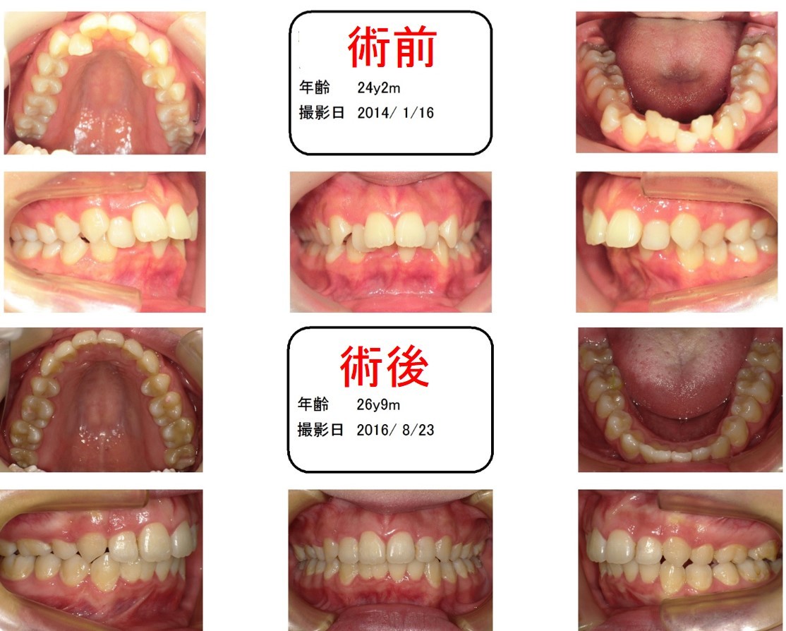 上左右一本ずつ歯を抜いて隙間を作り、上の前歯を後ろに下げます。ブラケット装置にて治療。