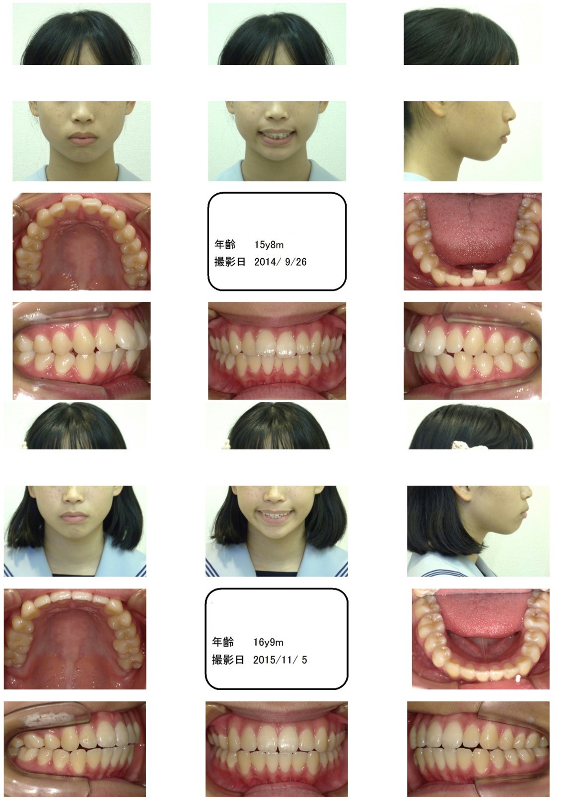 上左右一本ずつ歯を抜いて隙間を作り、上の前歯を後ろに下げます。ブラケット装置にて治療。