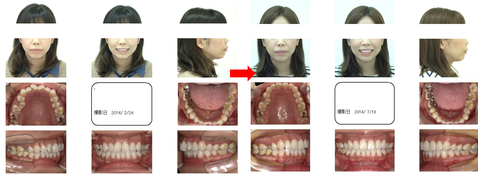 この症例は、前歯のデコボコが大きくないので、前歯だけの部分矯正にて歯ならびの改善をしました。