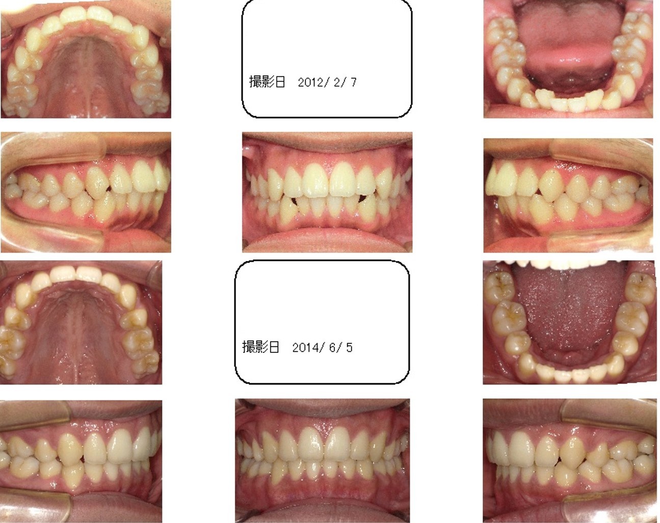上下左右一本ずつ歯を抜いて隙間を作り、上下の前歯を後ろに下げ、口元を下げます。ブラケット装置にて治療。