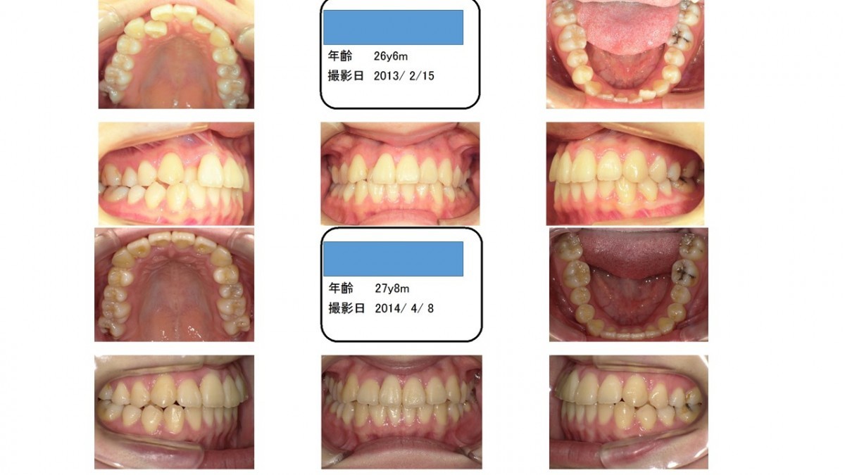 この症例の最初の状態は、歯を抜くかどうかの瀬戸際の症例だと思います。八重歯が左右ともでなく片側だけで、その奥の歯が前から見ても、見えている状態。これが、当院の基準となっています。
