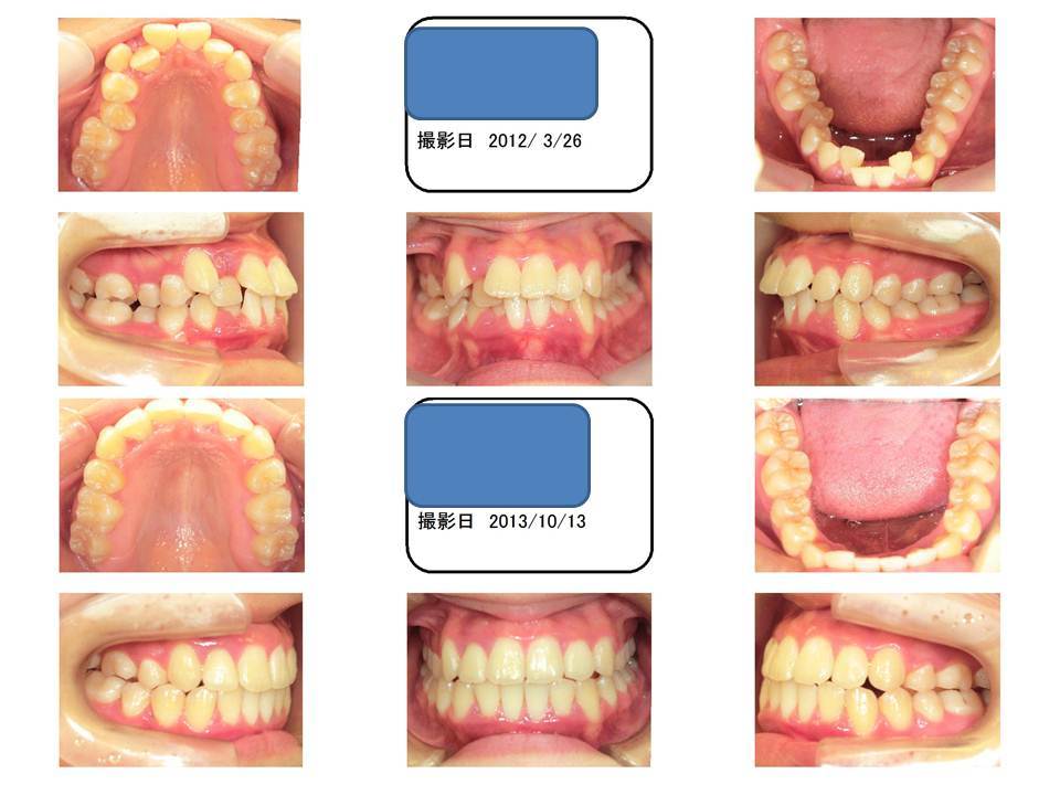 通常は、上下左右の歯1本ずつ抜くのですが、このケースは上顎の左右2本を抜いています。なぜかというと、奥歯の咬み合わせが出っ歯だからです。