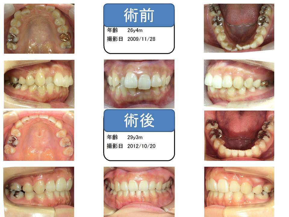 上下左右一本ずつ歯を抜いて隙間を作り、前歯のデコボコ・八重歯を改善します。