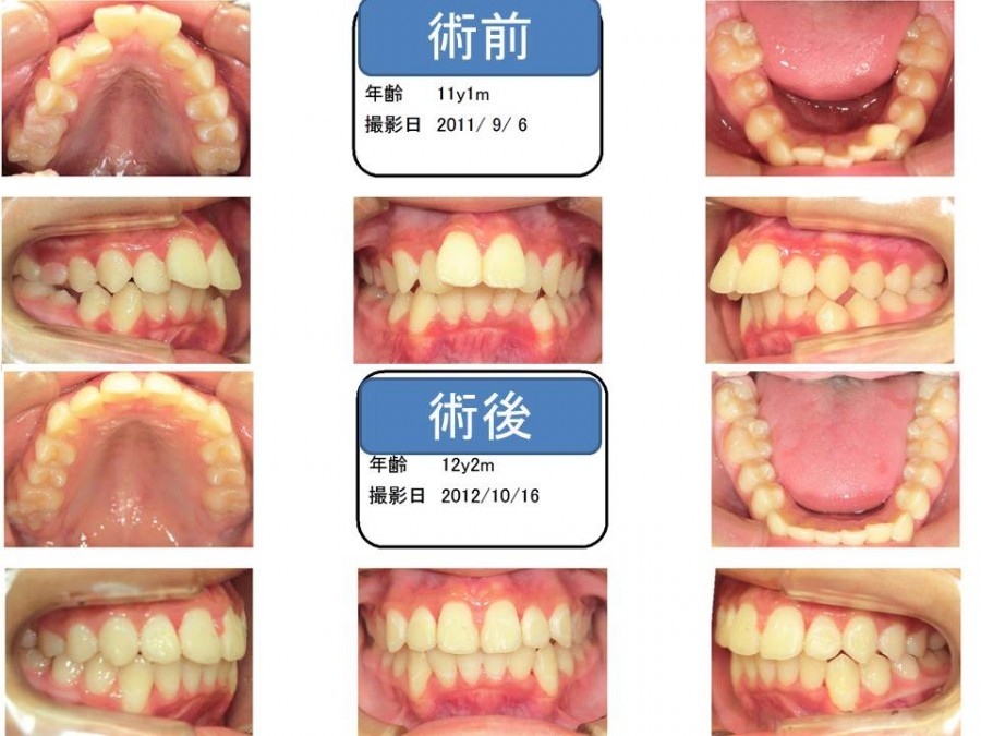 出っ歯については下顎を成長させることにより改善しています。下顎が前に伸びるようなマウスピースを寝るときだけ半年間くらい使用してもらいました。