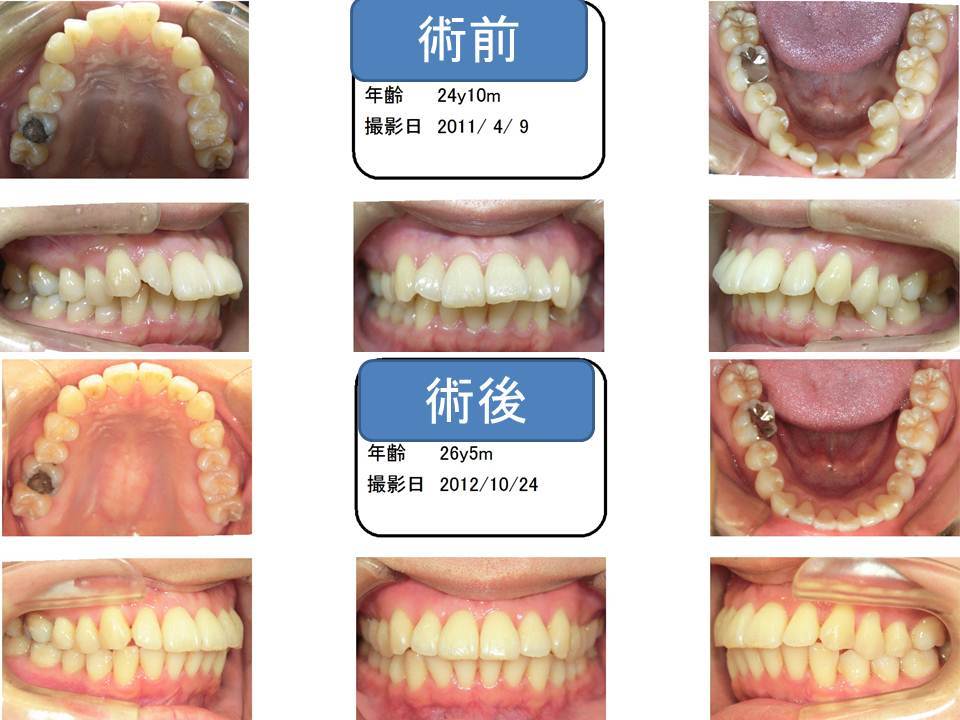 上を引っ込めるのに、通常は上の歯を2本抜くことが多いのですが、この場合は上の歯全体を後ろに引っ込める治療方針で矯正しました。