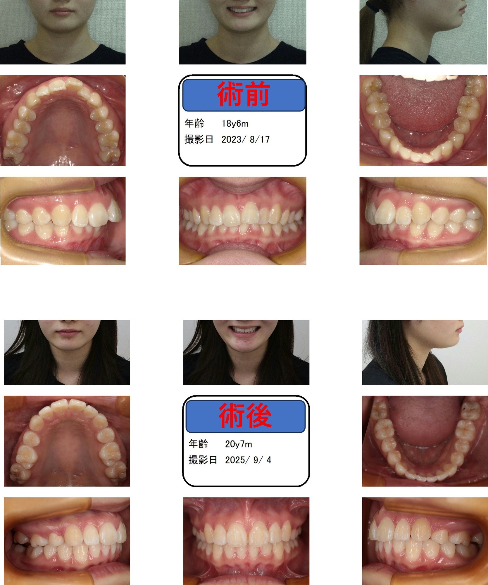 上左右一本ずつ歯を抜いて隙間を作り、上の前歯を後ろに下げます。ブラケット装置にて治療。